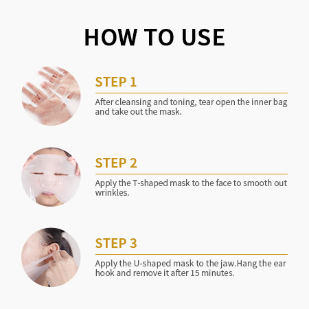 Description:Contains bifida yeast and bosera ingredients, T-shaped and U-shaped double membrane design, and sodium hyaluronate to help replenish skin moisture, lift and tighten facial skin, and improve skin sagging. At the same time, the U-shaped mask can enhance the refinement of facial skin. Persistent use can make skin elastic, firm and shiny.