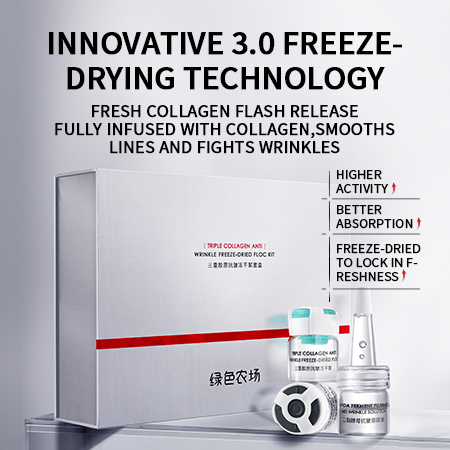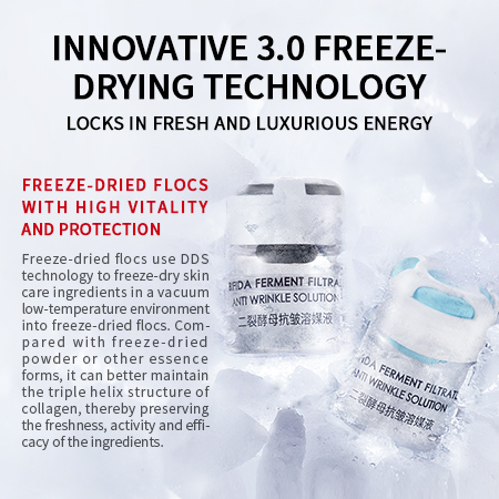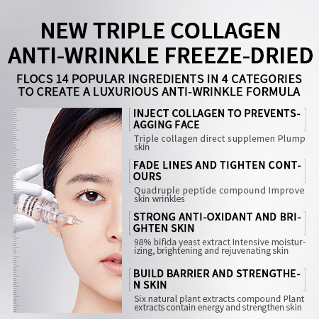 Description: Using advanced freeze-drying technology, skin care ingredients such as atelocollagen, collagen, and soluble collagen are freeze-dried into flocs, and combined with bifida yeast extract to help the skin resist wrinkles and reduce lines, making the skin hydrated and firm, showing a charming, elastic and delicate style.