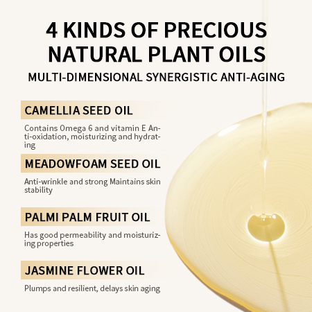 Description: Camellia extract is blended with multiple plant extracts to create a refined formula. Each drop of precious essence has a light texture, is moisturizing but not greasy, and protects delicate skin. It moisturizes the skin with oil.